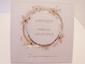 Dla Kasi i Mateusza powstało takie stadko zaproszeń. Część jest na białej bazie a częśc na kremowej. Na weselu dominować ma złoty kolor.  Wianki ozdobiłam kryształkami.