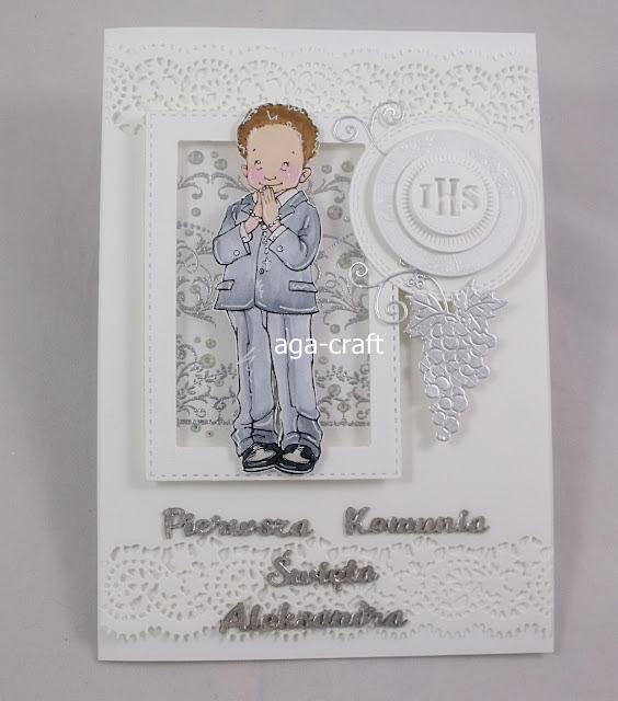 Pamiątka komunijna w torebce. Stempelek tutaj pomalowany copicami, błyszczący brokatem. Swojskie kwiatuszki na torebce :)