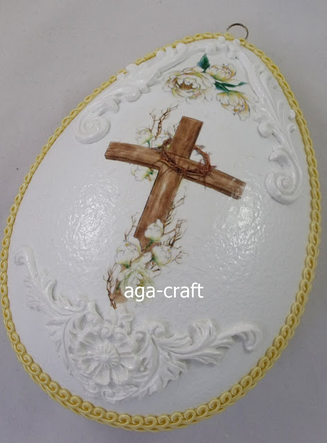 "Przychodzisz Panie mimo drzwi zamkniętych. Jezu Zmartwychwstały ze śladami męki." Jajka duże 20 cm na bazie ze sklejki, jajka medaliony 16 cm plastikowe, serduszko 15 cm - Inspirello. Papiery decoupage -Studio 75.